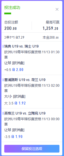 欧洲U19青年锦标赛11/13 01:30瑞典 U19 vs. 瑞士 U19 瑞典+0.5